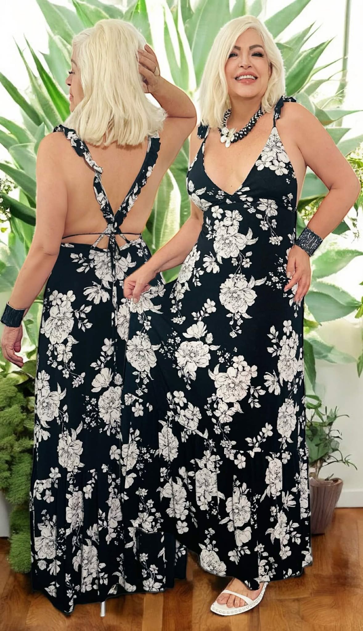 🎨 Estampado Floral Llamativo: El estampado floral de este vestido, con flores grandes y llamativas en tonos blanco y negro, es original y llamativo. Este estampado versátil combina fácilmente con diferentes accesorios y calzado, permitiéndote crear looks únicos y personalizados.